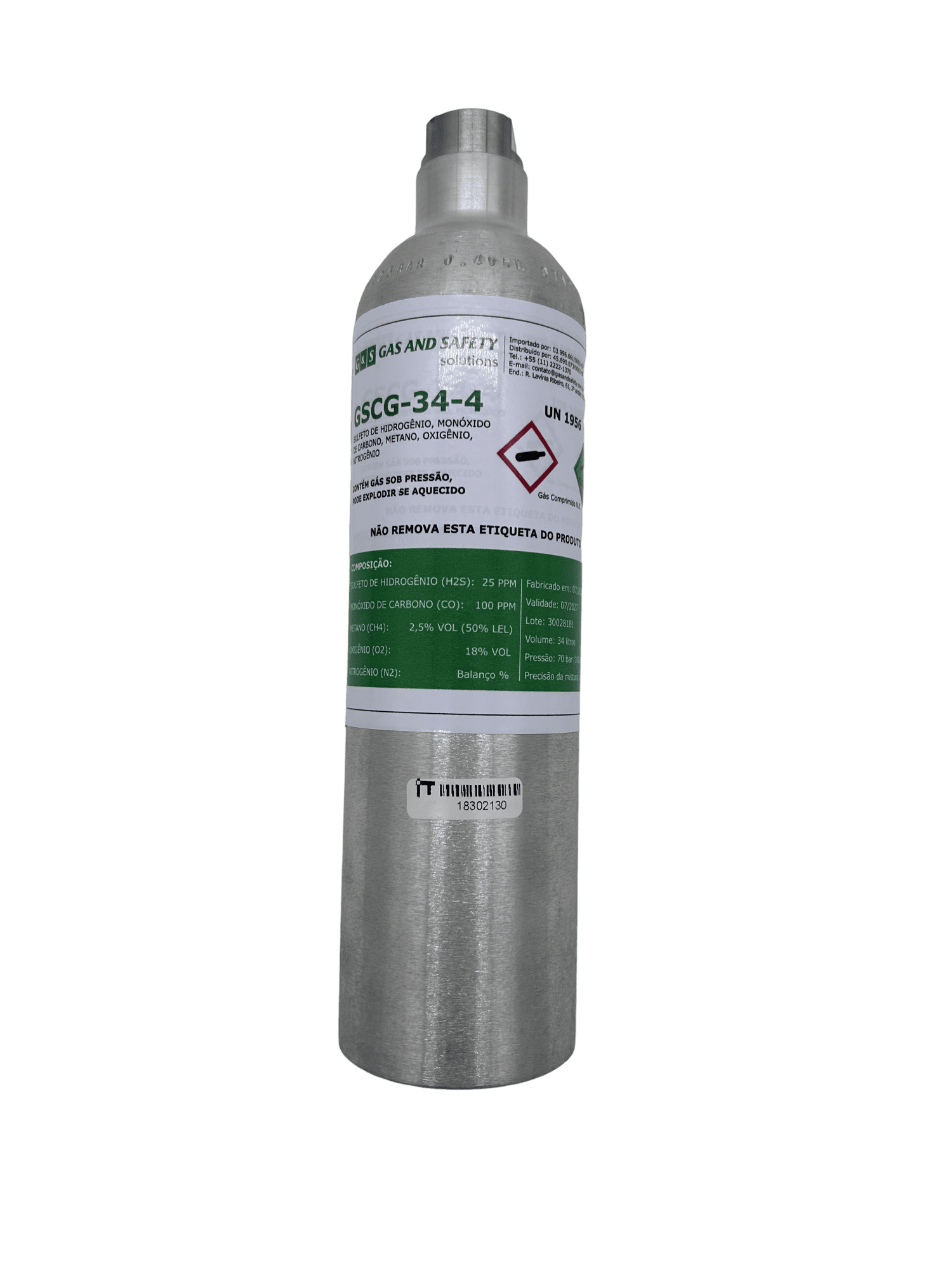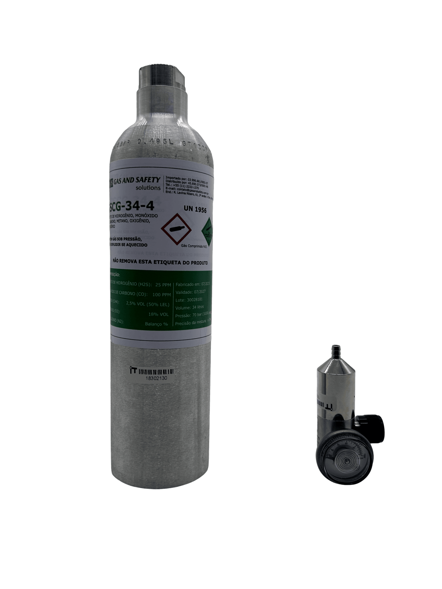 Cilindro de 34L com 1000 PSI de gás padrão para calibração de detectores de 4 gases.